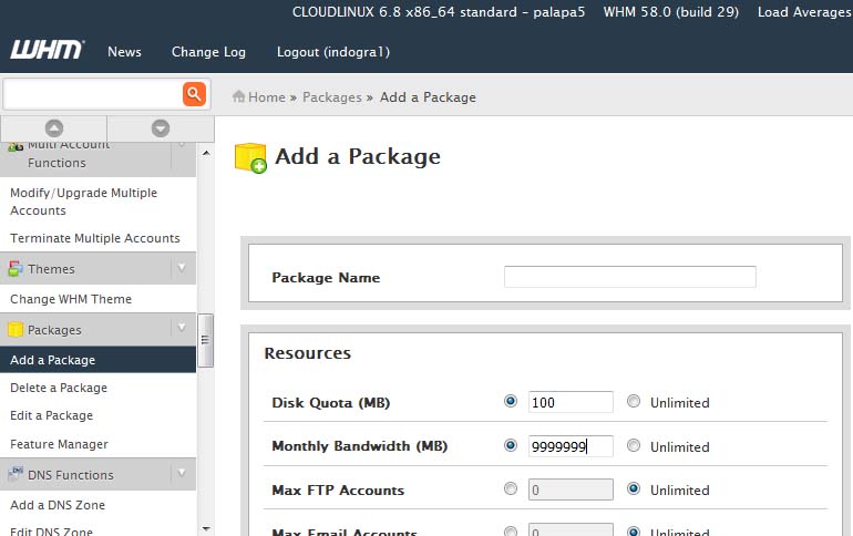Untuk bandwidth, tidak dapat membuat paket “unlimitedâ€, walaupun porsi reseller bandwidth anda tak dibatasi jumlah penggunaannya. Jika kita ingin memberi bandwidth yang besar untuk pelanggan maka isilah dengan angka yang besar seperti 9999999 apabila anda punya unlimited pada bandwidth. Namun berakibat anda tak dapat menggunakan paket hosting tersebut untuk pelanggan.