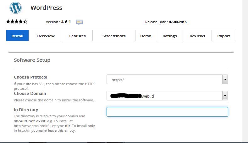Klik Install Now, maka anda masuk ke halaman pengisian. Untuk Choose protocol dan Choose domain biarkan saja, lalu hapus tulisan wp pada In Directory. Selebihnya anda bisa melengkapi isian yang lain.
