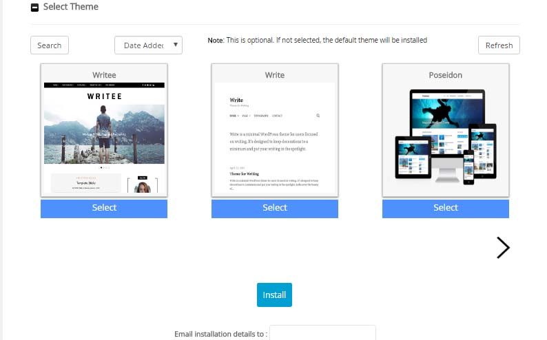 9. Pada bagian Select Theme, pilih tema yang anda inginkan untuk tampilan web anda. Jika sudah klik Install.