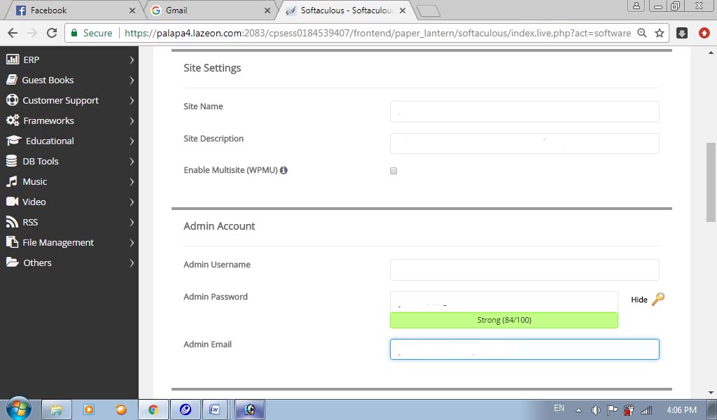 8. Pada Setting site isi nama situs dan deskripsi situs web anda, lalu di Admin Account isikan Username dan Password.